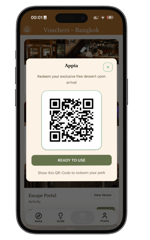 Simply open the voucher inside the app, tap redeem, and show the QR code to the venue staff to receive your perk.