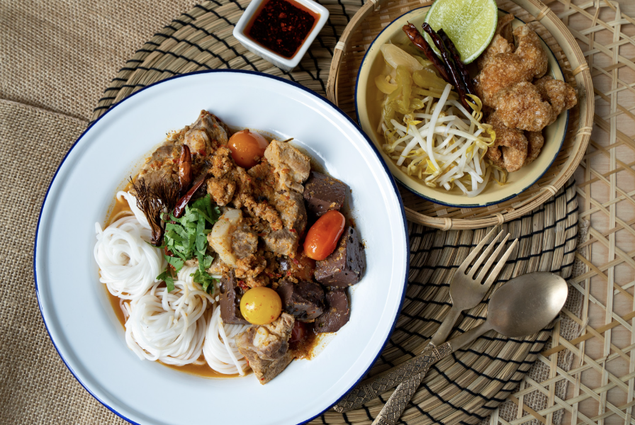 The base is thick and aromatic with turmeric and curry paste. On top, you get crispy fried noodles that add texture to every bite. It is usually served with chicken or beef, alongside pickled mustard greens, shallots, lime and chili oil so you can adjust the flavor yourself.