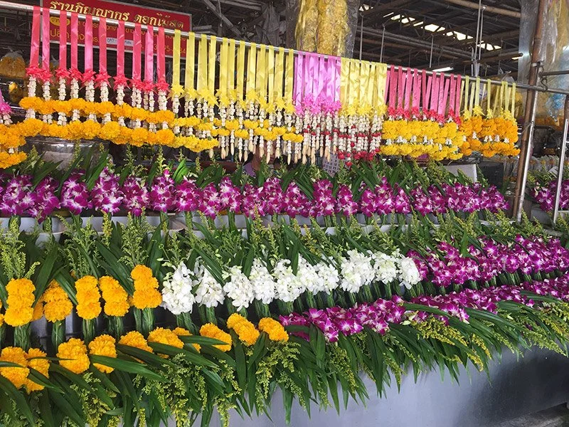 You will see vendors offering bunches of flowers as well as hanging long garlands. The marigold, lotus, and orchids are not decorative pieces; they are commonly offered in Buddhist merit-making.
